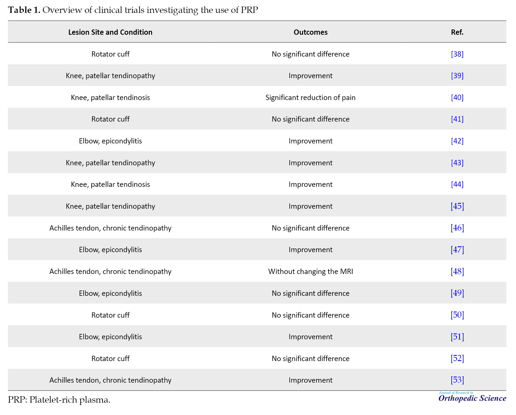 - Kaux JF, Crielaard JM. Platelet-rich plasma application in the management of chronic tendinopathies. Acta Orthopaedica Belgica. 2013; 79(1):10-5. [Link]