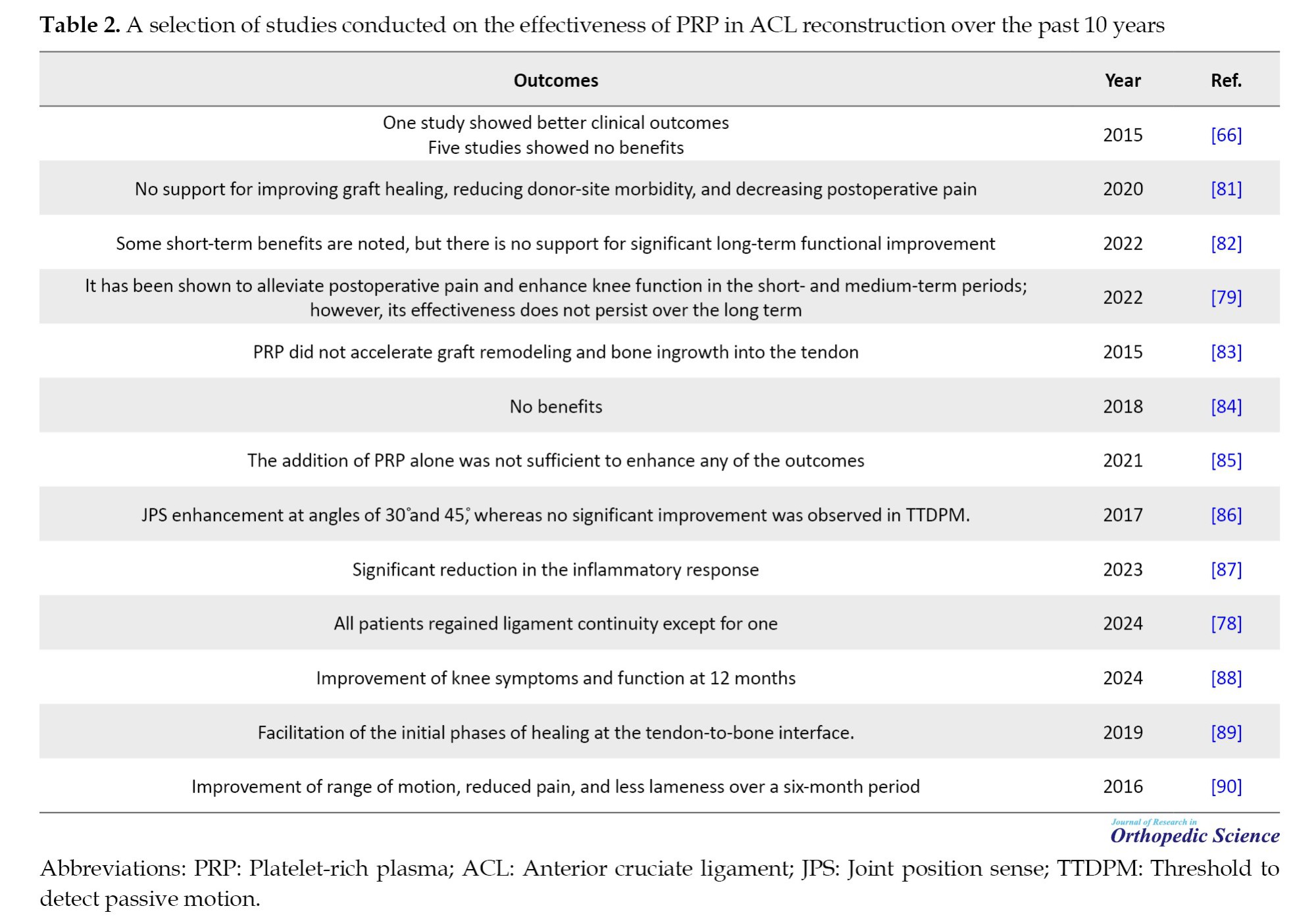 The outcomes of some of the most significant studies conducted on the effectiveness of PRP in ACL reconstruction over the past 10 years are presented in