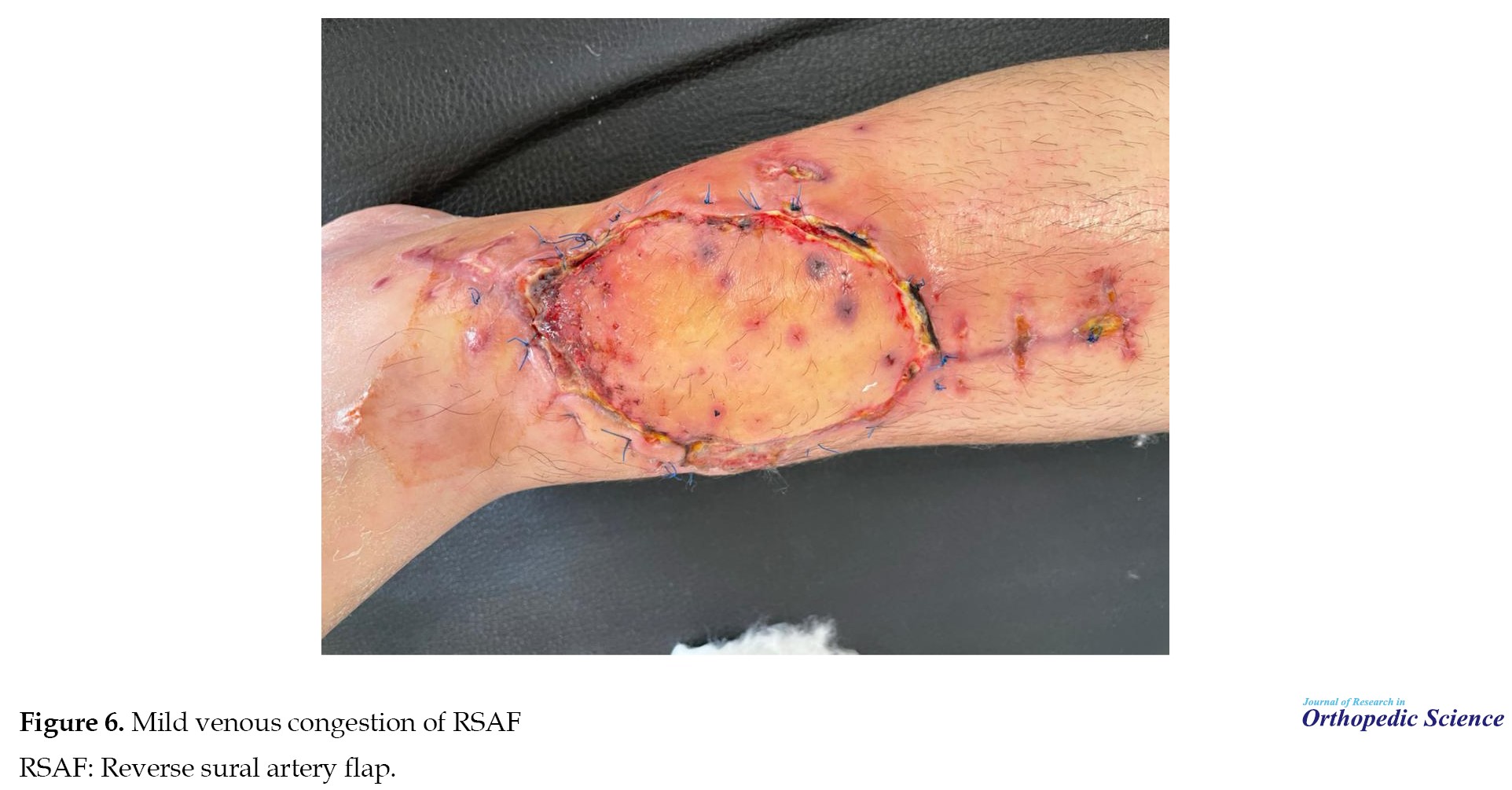 8]. The present study was conducted to investigate the incidence of venous congestion in RSAFs used to reconstruct soft tissue defects of the distal tibia, ankle, or heel and to determine the associated risk factors. The results showed that 71.8% of the evaluated patients developed flap venous congestion of various severities. In patients with low degrees of flap congestion, leech therapy was used; in more severe cases, skin grafting was performed after debridement, and in two cases with very severe flap congestion, free flaps were performed. By investigating the underlying factors and incidence of congestion in RSAF, it was found that smoking, drug addiction, late referral, and the simultaneous presence of fractures were associated with increased venous congestion. Different degrees of flap congestion may also be due to a combination of these four risk factors and the small sample size.