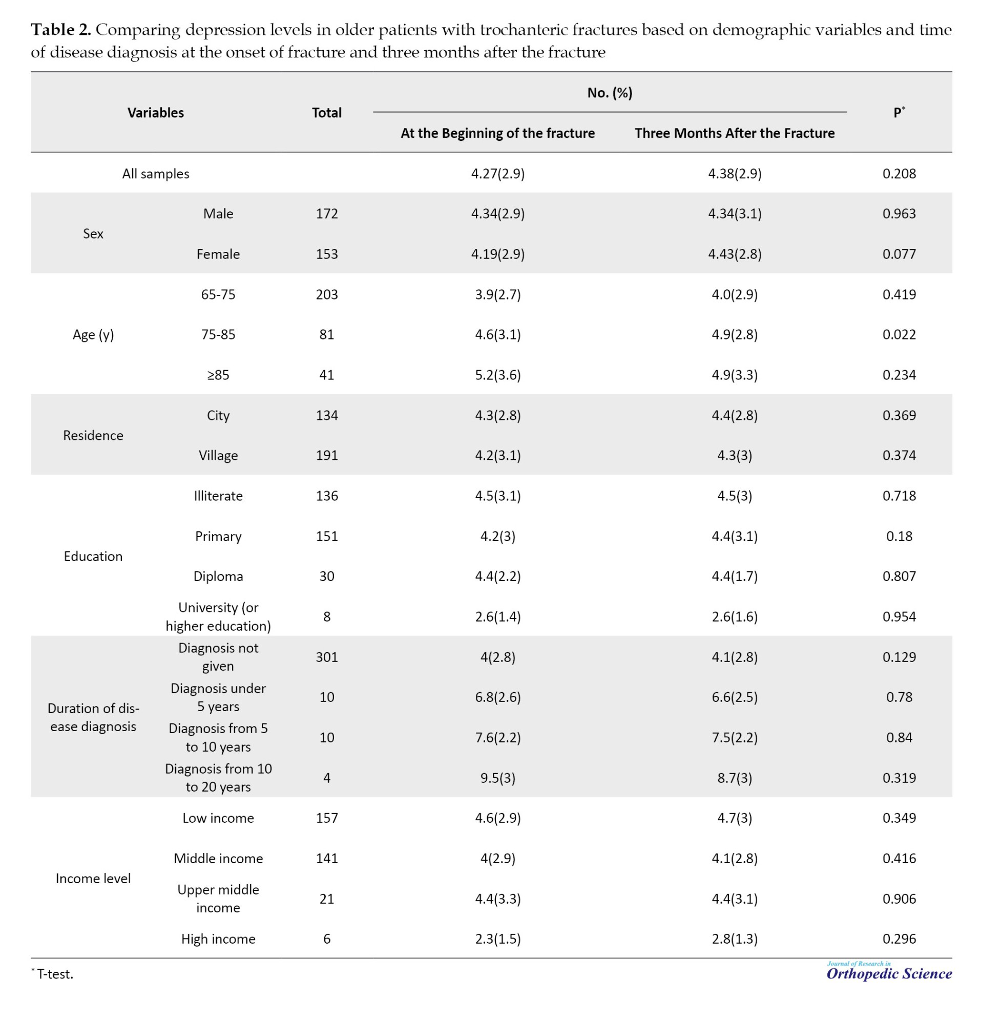 The Mean±SD age of patients with trochanteric or periprosthetic hip fractures over 65 years old at Imam Khomeini Hospital is 74.9±8.9 years. The mean depression score (at the time of fracture) for these patients was 4.27±2.98. The paired samples t-test reveals no significant difference in depression levels between the onset of the fracture and three months later (P>0.05) (Table 1).