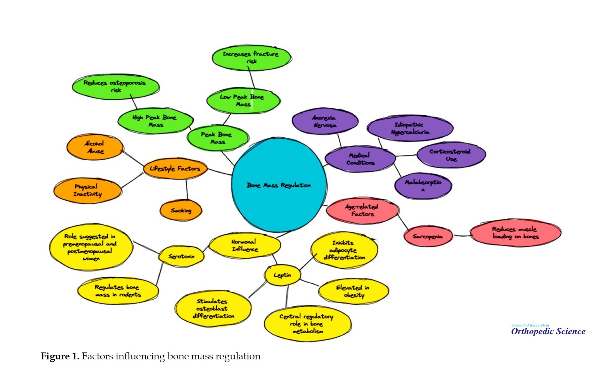 Several clinical studies have highlighted the intricate relationships between body fat, bone mass, and regulatory hormones such as leptin and serotonin. Leptin, a hormone elevated in obesity, is closely associated with fat mass and has been found to influence bone metabolism through its effects on osteoblast differentiation and neuronal pathways. Similarly, serotonin has shown potential regulatory effects on bone mass in both animal and human studies. The development of peak bone mass is a critical determinant of age-related bone loss, with higher peak bone mass serving as a protective factor against osteoporosis. Other contributors to fracture risk include medical conditions, behavioral factors, and possibly sarcopenia, which can reduce muscle loading on the bone [50-60]. Additional details are provided in Figure 1.