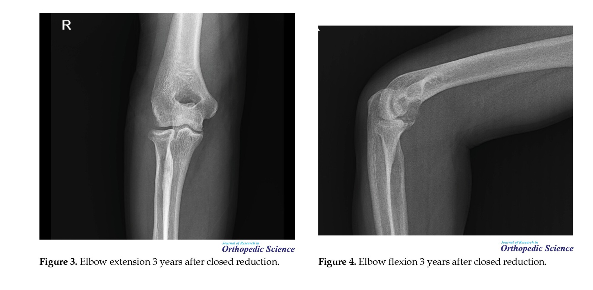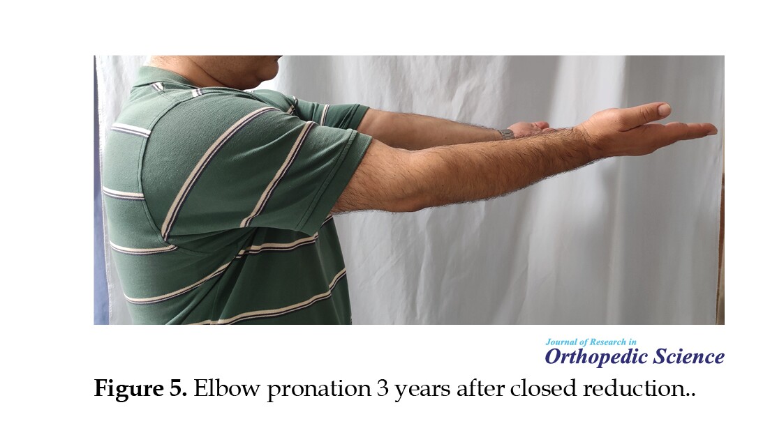 Patients were referred to physiotherapy for early active ROM exercises, with extension initially limited to 45 degrees and gradually increased weekly. Functional outcomes were assessed using the Mayo elbow performance index (MEPI) and the disabilities of the arm, shoulder, and hand (DASH) score. ROM was measured using a goniometer, and radiographic evaluation was performed to determine joint congruency, fracture :union:, and the presence of arthritis (Figures 3, 4, 5 and 6).