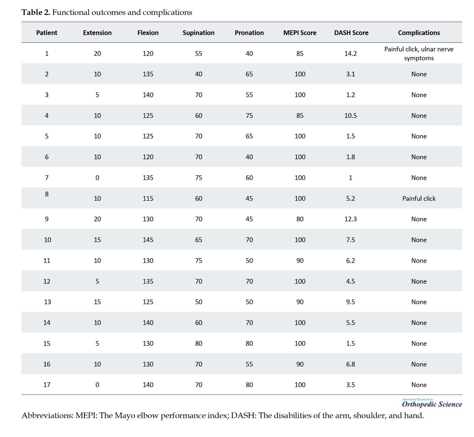 The mean MEPI score was 95.29±6.95, and the mean DASH score was 5.64±4.06. The mean ROM for the affected elbow was 9.71±5.72 degrees in extension, 130.6±8.27 degrees in flexion, 65.29±10.07 degrees in supination, and 59.71±13.4 degrees in pronation. The functional outcomes and complications are summarized in Table 2.